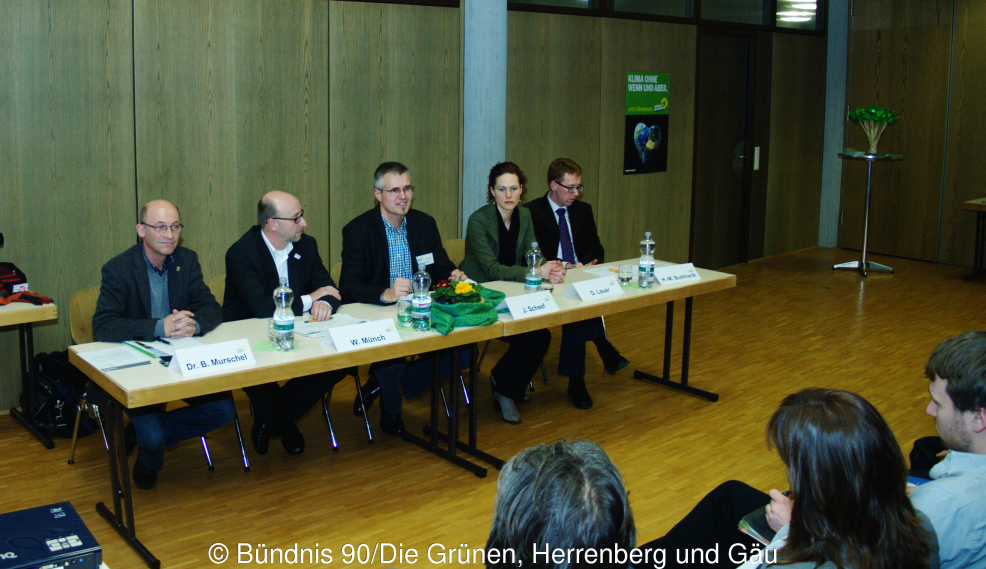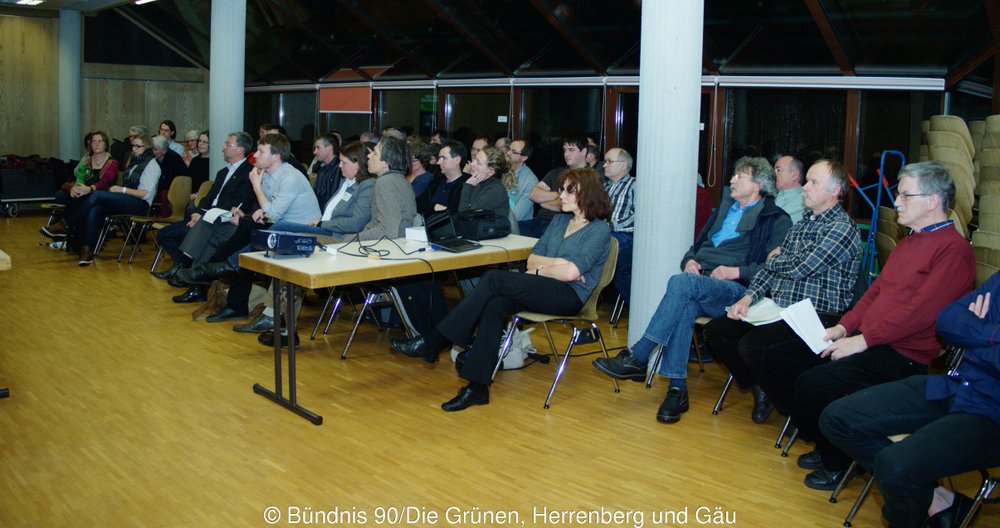 Das Thema Windkraft trieb mehr als 50 Personen in den Jettinger Mehrzweckraum. Auf dem Podium der Diskussionsveranstaltung am Freitag 01. Februar saßen Dr. Bernd Murschel, MdL, Wilfried Münch von der GLS-Bank Stuttgart, Diana Lauer von der Badenwind GmbH und der Jettinger Bürgermeister Hans Michael Burkhardt. Baden-Württemberg sei in Deutschland Schlusslicht bei der Nutzung der Windenergie. Bis 2020 sollen aber 1200 neu Windräder im Südwesten erstellt werden, erläuterte Dr. Murschel die Ziele der Landesregierung. Dazu werden derzeit planungsrechtliche Grundlagen verändert. Im Auftrag des Umweltministeriums ist zur Versachlichung der Standortsuche ein Windatlas entstanden. Dr. Murschel rechnet damit, dass es noch bis etwa 2015 dauert, bevor sich die Anzahl der Windräder im Land deutlich erhöhen wird. Angesichts der 2- bis 3jährigen Vorlaufzeit ein optimistischer, aber nicht unrealistischer Ansatz. Wie der Bau einer Anlage finanziert und durch Bürgerbeteiligungen organisiert werden könnte, das erläuterte Herr Münch, der die Stuttgarter Filiale der GLS-Bank leitet. Windenergie gehöre in Bürgerhand. Da es für Bürgerinitiativen oft aber schwierig sei, das nötige Startkapital aufzubringen, sehe sich die GLS-Bank, die soziale und ökologische Projekte finanziert, als Partner für Bürgerbeteiligungen. Die Podiumsdiskussion fand nicht zufällig in Jettingen statt: Dort stehen, allerdings bereits auf Nagolder Gemarkung, seit etwa 20 Jahren zwei Windräder. Frau Lauer informierte über die technischen Details und die Voraussetzungen, die für einen Standort notwendig sind. Im Landkreis Böblingen gibt es nur sehr wenige Gebiete, die genügend Wind aufbieten, um ein Kraftwerk wirtschaftlich betreiben zu können. Um Jettingen herum seien die Windverhältnisse aber geeignet. Anhand zweier möglicher Standorte, sogenannter Suchräume, erläuterte Frau Lauer das Vorgehen. Innerhalb eines Suchraumes bleiben oft nur kleine Flächen als konkrete Orte übrig, denn Windräder brauchen Mindestabstände von Wohnbebauungen, Straßen, Hochspannungsleitungen. Die heutigen Anlagen seien etwa 4 bis 5 mal so hoch wie die Räder, die zurzeit bei Jettingen stehen. Dafür bringen sie aber das 20- bis 30fache an Leistung, bei langsamerer und damit als ruhiger empfundener Rotordrehzahl. Das Fazit von Frau Lauer: Bei Jettingen seien erfolgversprechende Windrad-Standorte zu finden, von denen aus keine Störungen der Bevölkerung ausgingen und die gleichzeitig landschaftskompatibel seien. Jettingens Bürgermeister Burkhardt bekräftigte, dass die Gemeinde sich sehr mit dem Thema Energieeffizienz und regenerativer Energiegewinnung beschäftige. Im vergangenen Jahr debattierte der Gemeinderat zu dem Thema. Es wurde die Ausweisung eines Suchraumes für Windanlagen auf Jettinger Markung in der unmittelbaren Nähe zu den derzeitigen Rädern beschlossen. Um dort die Standortsuche voranzutreiben, liege der Antrag, diesen Raum als Vorrangfläche im regionalen Flächennutzungsplan auszuweisen, derzeit beim Verband Region Stuttgart. In der Publikumsrunde wurde das Thema der Windenergie kritisch hinterfragt. Es entspann sich eine sehr sachlich geführte Diskussion. Die Stimmung im Saale war sehr deutlich Pro Windkraft. Zumal es sich bei dieser Form lokal erzeugter Energie um ein sehr effizientes Verfahren handelt, bei dem für den Stromtransport keine langen Leitungswege erforderlich sind. Offen blieb jedoch die Frage, wie es denn konkret aussehen könnte mit neuen Windkraftanlagen auf Jettinger Gemarkung. Bürgermeister Burkhardt sagte, die Gemeinde würde als Betreiber nicht zur Verfügung stehen. Er könne sich aber eine Beteiligung seitens der Gemeinde durchaus vorstellen. Außerdem werde ich Verwaltung alles in ihrer Macht stehende tun, um das Aufstellen von Windkraftwerken konstruktiv zu begleiten – möglichst in der Eigenregie der Bürger. Zusammenfassend kann gesagt werden, dass Windenergie ein zukunftsorientierter Ansatz zur Energiegewinnung ist, der, richtig geplant und geprüft, als umweltverträglich gelten kann. Wichtig im Prozess ist es, die Bürger und Bürgerinnen mitzunehmen und in Entscheidungen einzubinden. Wir vom OV Herrenberg / Oberes Gäu werden das Thema weiter vorantreiben.