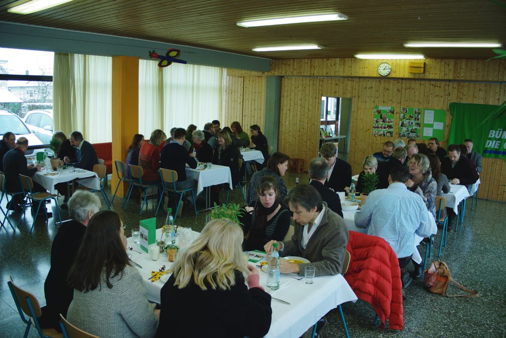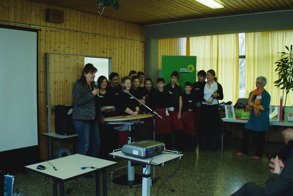 Zu Gast in der Albert-Schweitzer-Schule in Herrenberg haben wir uns auf das Jahr 2013 eingestimmt. Und dieser Auftakt war eine runde Sache: Schulleiter Hubert Wyrwich bot in seinem Vortrag einen Einblick in die Förderschule und deren Konzept. Damit waren die Themen Bildung, Inklusion und Integration, die uns in Herrenberg sehr beschäftigen, gesetzt. Die Klasse 6 der Schule hat, unter der Leitung der Lehrkräfte Katharina Rank und Volker Joas, die Bewirtung der Veranstaltung übernommen – in begeisternder Manier. Auf diesem Wege wurde das vorgetragene Konzept gleich erlebbar. Es gab vegetarische Gerichte, passend zu der von uns ausgestellten Kampagne „Klimaschutz mit Messer und Gabel“. Sven Reisch, Bundestagskandidat für den Wahlkreis Böblingen, empfahl dem Auditorium den neuen „Fleischatlas“ der Heinrich-Böll-Stiftung. Er spann in seiner Rede – „global denken, lokal handeln“ - einen Bogen von der Welt- über die Bundespolitik bis hin zu der politischen Willensbildung in den Kommunen. Mit Blick bereits in das nächste Jahr sagte Sven: „Herr Gravert wird sich sicher freuen, wenn nach den nächsten Kommunalwahlen mehr Grüne im Gemeinderat sitzen werden.“