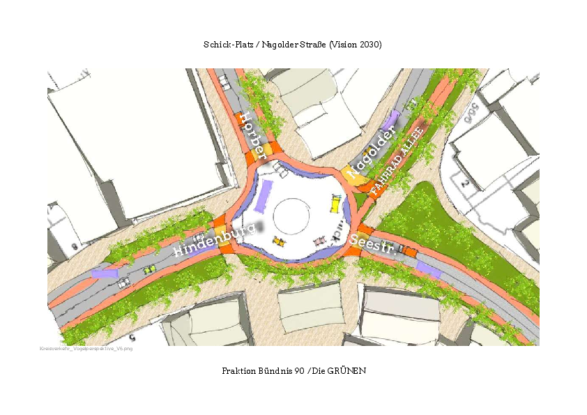 „Die logische Fortführung Umgestaltung in der Nagolder Straße wäre ein Kreisverkehr am Schickplatz, bei dem der Radverkehr seine eigene Spur bekommt“ schlägt Steinki vor. Durch den Wegfall der Ampeln würde sich der Verkehr verflüssigen und der Fußgängertunnel unter dem Schick-Platz könnte ebenso wegfallen. Nach den Richtlinien für die Anlage von Stadtstraßen wäre ein einspuriger Kreisverkehr mit einem Durchmesser 26 Meter für bis zu 40.000 Fahrzeuge täglich geeignet. „Da wäre sogar noch Platz für ein Radfahrer-Ring drumherum“ meint Steinki.