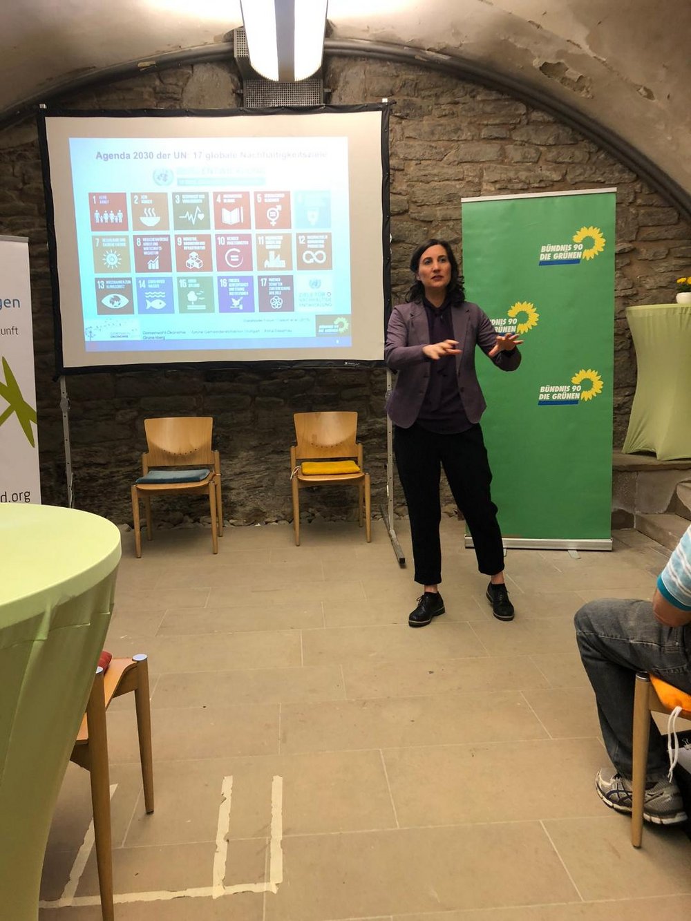 Dr. Heike Voelker, die für Bündnis 90/Die Grünen auf Platz eins für den Herrenberger Gemeinderat kandidiert, übertrug im Anschluss das Gesagte auf Herrenberg. So solle im anstehenden "Leitbild 2030", anders als im aktuellen "Leitbild 2020", der Begriff "dem Gemeinwohl verpflichtet" im Zentrum stehen. Auch müsse die Stadt durchaus transparenter kommunizieren - sei doch Transparenz eine der zentralen Forderungen der Gemeinwohlwirtschaft. Als Beispiel nannte sie die Studie zur Parkraumsituation in Herrenberg, die nach wie vor nicht veröffentlicht sei. Auch verwundere, dass im IMEP, dem Integrierten Mobilitätsentwicklungsplan, das Thema Klimaschutz praktisch nicht auftauche. Sie verwies aber auch auf positive Beispiel in Herrenberg. So feiere die Lokale Agenda mit ihrem Motto "global denken - lokal handeln" gerade ihr 20jähriges Jubiläum. Im Weltladen der Eine-Welt-Initiative sowie dem AK Energie seien durchaus schon Elemente der Gemeinwohlökonomie umgesetzt. Ihre Idee: jetzt auch die Stadtwerke GWÖ zertifizieren zu lassen.