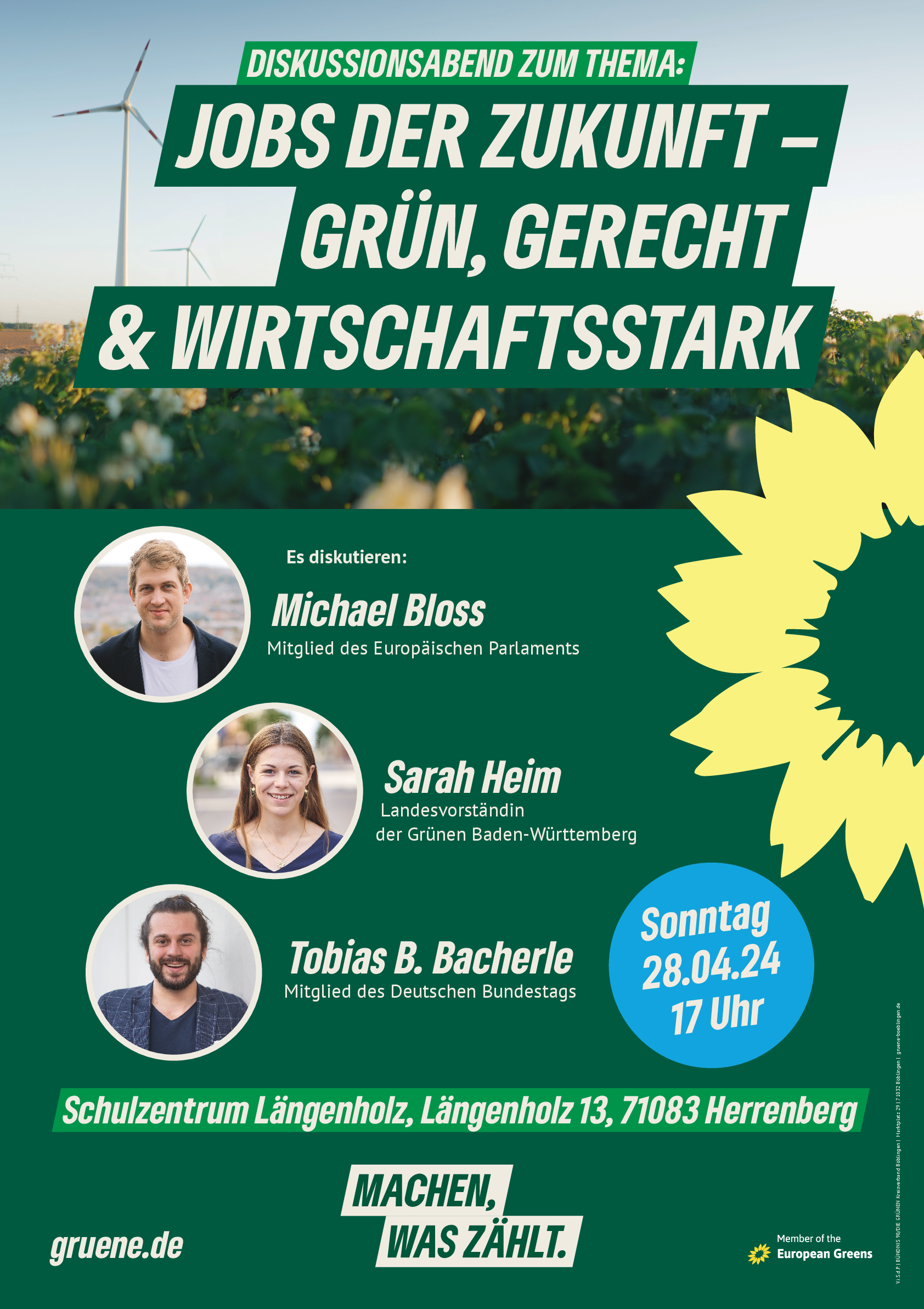 In Kooperation von Grünem Ortsverband Herrenberg und dem Kreisverband Böblingen diskutiert Michael Bloss, Mitglied des Europäischen Parlaments und Spitzenkandidat der baden-württembergischen Grünen für die EU-Wahl mit Tobias B. Bacherle, Bundestagsmitglied und Sarah Heim, Vorstand der Grünen Jugend Baden-Württembergs. Wie können zukunftssichere Jobs durch zielgerichtete Investitionen und eine klimaneutrale Modernisierung der Wirtschaft geschaffen werden und zu einem gerechten Wohlstand in Europa führen? Mit dem Atrium vor der Mensa Längenholz haben die Grünen in Herrenberg einen neuen Veranstaltungsort gefunden.